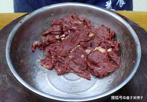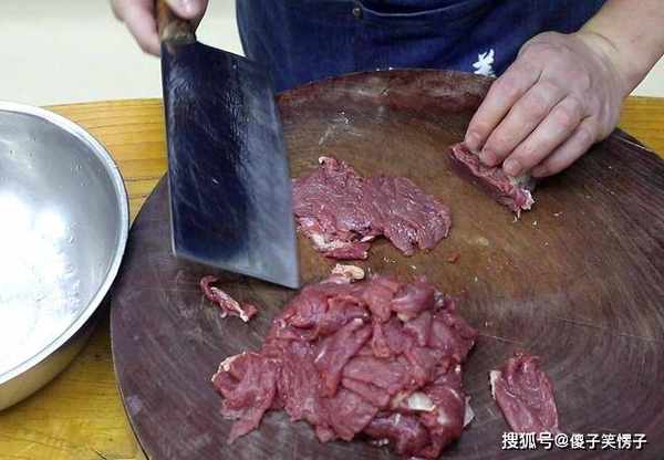 1.准备一斤半牛里脊肉,顶刀切成2毫米的大肉片子,这是现杀的鲜牛肉,处理的时候不能清洗沾水,吃的就是肉本身的鲜乎,如果是冻牛肉就必须浸泡,清洗去血渍。