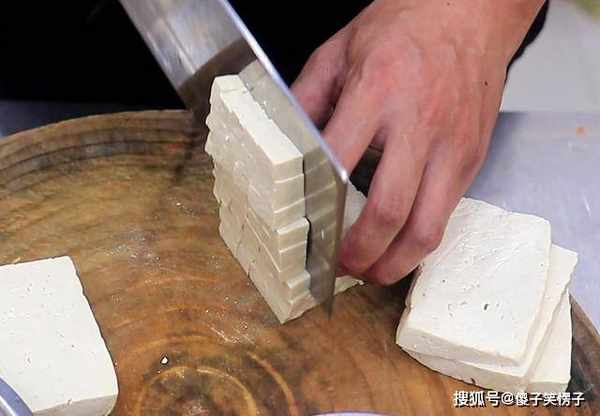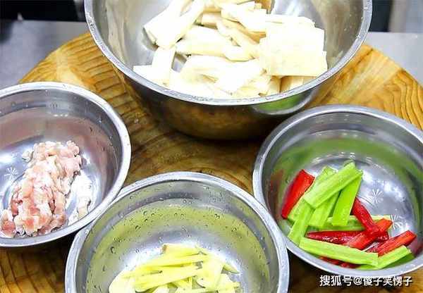 4.锅内烧水,水烧开以后,把肉丝倒入锅中,肉丝变色以后倒出来,控水备用。锅内再烧水,加入一勺食盐入底味,把豆腐倒入锅中,焯水1分钟左右倒出来,快速用清水冲洗一下,以免豆腐粘在一起,这一步主要是为了去除豆腥味。