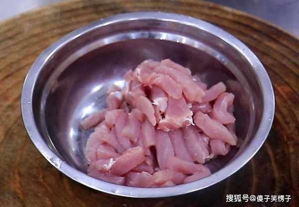 1.准备里脊肉一块,把表面的白色筋膜去除干净,先切成厚片再切成1厘米左右的宽条,切好以后放入盆中,加入一勺食盐,倒入一点料酒去腥,用手抓匀腌制10分钟。