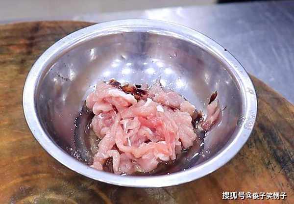 3.准备肉丝100克,加入少许食盐,倒入一点料酒去腥,少许老抽上色,用手抓匀腌制10分钟。