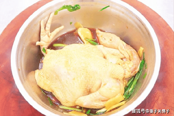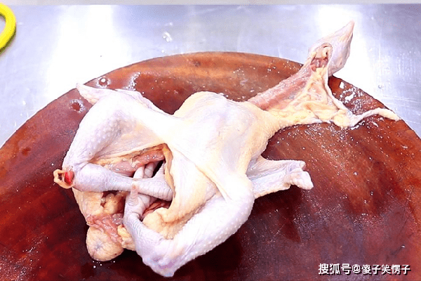 1.准备一只宰杀干净的三黄鸡,把鸡爪折断塞进肚子里面,去除淋巴、气管和鸡屁股,然后清洗干净准备腌制。