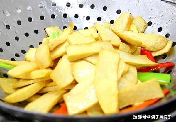 2.锅中烧油,油烧至5成热时,放入切好的杏鲍菇,滑油大约30秒,香鲍菇表面呈微黄色时,再放入青红椒,继续炸10秒钟,倒出来控油备用,滑油这一步很重要,能够逼出杏鲍菇的水分,避免炒的时候大量出水,还能减少炒制时间,口感更加嫩滑。