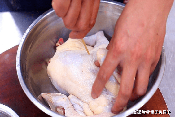 3.用竹签在鸡身上扎一些小孔,尤其是鸡腿和鸡胸这两个部位,因为肉质比较厚 ,一定要多扎一些小孔、方便入味。