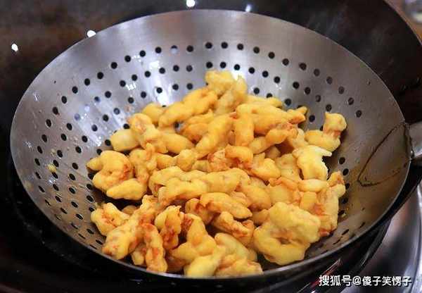 4.锅内烧油,油温五成热时,把里脊肉一个一个放入锅中,以免粘在一起,里脊肉遇热以后会慢慢地浮起来,用勺子轻轻地推动,让它均匀受热,保持小火,大约炸3分钟,里脊肉炸酥、炸成金黄色即可。
