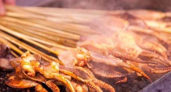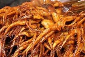 3.在烤制过程中,要不时地往鱿鱼表面撒五香粉、孜然粉、辣椒粉、花椒粉,直到把鱿鱼烤熟时,再往其表面刷一层飘香酱,即成。