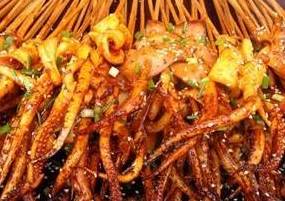 1.把鱿鱼切成长3.5厘米、宽1.5厘米、厚0.8厘米的块,入盆与以上调味品拌匀后,腌渍20分钟。接下来用竹签将鱿鱼块穿成串,要求大小均匀一致。