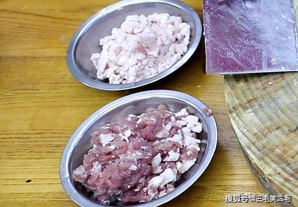 ,也切成碎粒放在一起备用,这里五花肉主要用来增香,不能抢了牛肉的味道,这里肥肉的用量要比瘦肉多一点。
