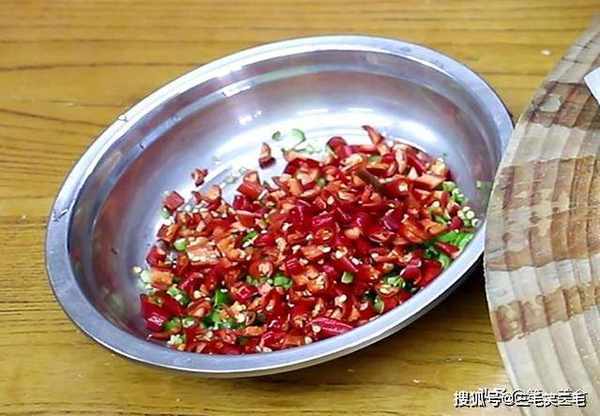 ,同样切成碎末,这里选的青红椒比较辣,不过在家做的话最好根据自己的口感选。