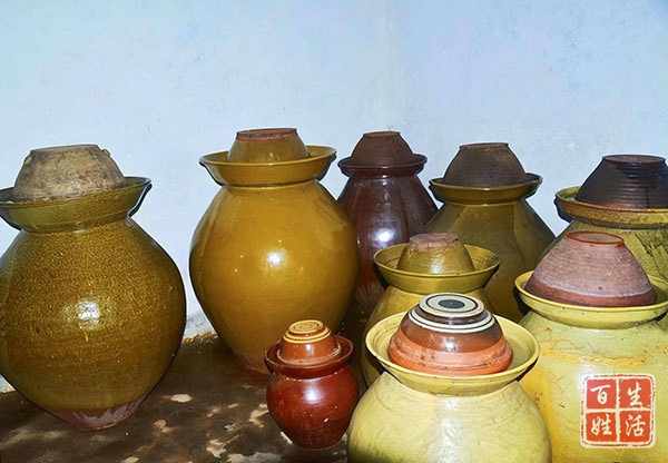 刘良刚带着我们走进院子旁边的两间小屋,里面存放着大大小小的20余个泡菜坛。他告诉我们,这些泡菜坛大多都是传承了三代以上,有的还是从师傅的师傅手里传下来的。每年自己都要和妻子制作7000多斤泡菜供烹饪使用,主要泡入青菜、仔姜和本地鲜辣椒,每坛泡菜制作完成后还会在坛子里放入几尾鲜活鲫鱼,泡上一年,鲜香扑鼻,是制作黄腊丁的必备调料。