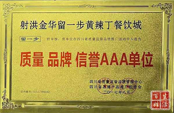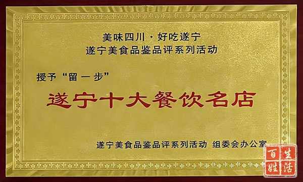 一分辛勤一份收获。近年来,“留一步”黄腊丁餐饮店先后被四川省名牌产品推广组委会、遂宁市美食品鉴品评组委会评为“四川省绿色生态放心食品单位”“四川省质量品牌信誉AAA单位”“遂宁市十大餐饮名店”、“留一步”黄腊丁被评为“射洪名吃”,刘良刚也被县政府多次评为“先进个体工商户”。