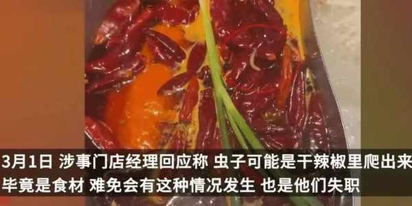 店主表示,那绝对不是蛆虫,就应该是蛋白质比较丰富的虫子,从干辣椒里爬出来了。他们后厨有时候清理食材的时候,可能没有仔细清理到位。
