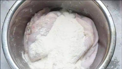 3.倒出粘液后,加入少许面粉。面粉吸水性很强,比淀粉好很多。然后继续用手揉。待面粉完全吸收后,放入流水下漂洗,放入盆中,倒入适量白醋,反复揉搓后再漂洗。