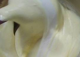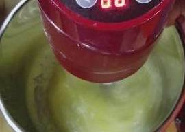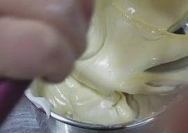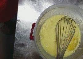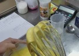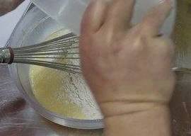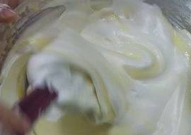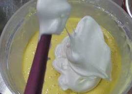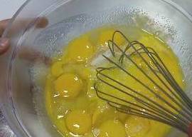 将三分之一蛋白放入蛋黄面糊中,手法是从盆底往上搅拌均匀