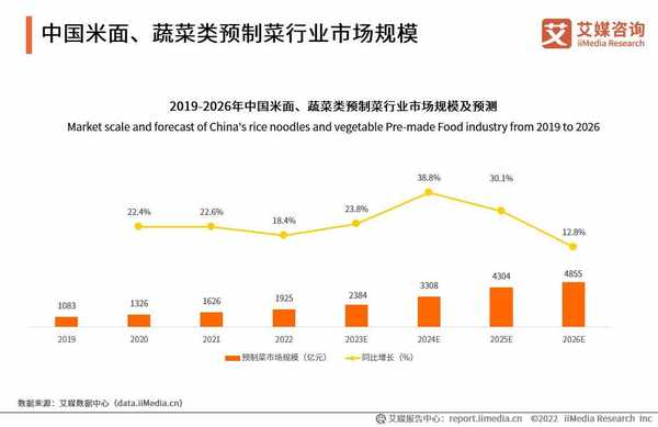 数据显示,预制菜兴起之后的2019-2021年间,米面、蔬菜类预制菜市场规模保持较高的增速持续增长,2022年市场规模达到1925亿元。预计米面、蔬菜类预制菜市场规模将以较高的速度增长,2026年将达到 4855亿元的规模。
