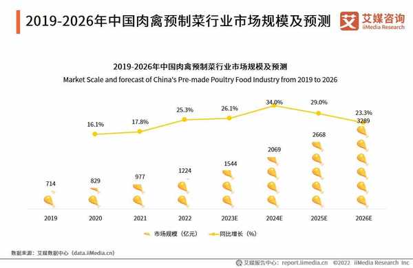 数据显示,2022年中国肉禽预制菜行业规模为1224亿元,同比增长25.3%,预计未来中国肉禽预制菜市场保持较高的增长速度,2026年肉禽预制菜市场规模将达3289亿元。中国居民消费升级,饮食理念改变,日常蛋白质摄入量提升,且年轻一代人追求饮食便利,有望持续拉动肉禽类预制菜市场上升。