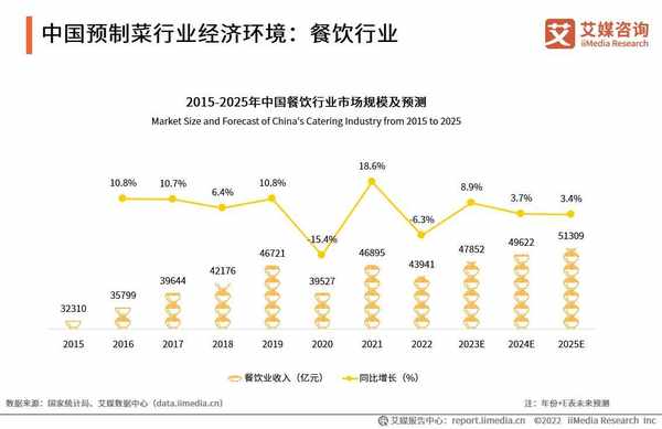 数据显示,2022 年中国餐饮行业规模为43941亿元,同比下滑6.3%。2022年餐饮行业受疫情影响仍较严重,预制菜的发展减少了因餐饮行业堂食业务减少而带来的亏损,并为行业提供了新的盈利模式。餐饮行业短期内将缓慢增长,预计2025年市场规模达51309亿元。