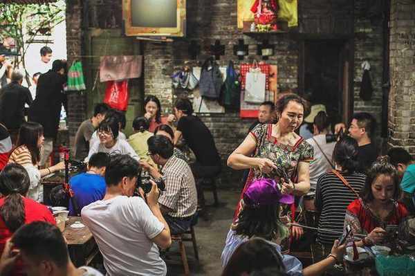 有一点很令人费解。这些茶馆破败不堪,破旧的墙壁,单人长凳,古老的方桌,传统的青花茶碗和青花茶杯。沧桑的岁月,还有立在煤气灶上冒着气泡的长嘴水壶,仿佛在向前来打卡的游客诉说着自己的故事,仿佛穿越到了60年代。老重庆的生活五花八门,也成了现实与乡愁中的“网红”