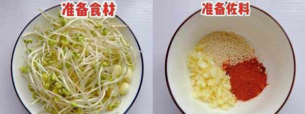 1、准备1块钱豆芽,洗干净放碗中。继续在碗中放蒜末、芝麻、辣椒粉三种配料、如果不吃辣,就不放辣椒粉。