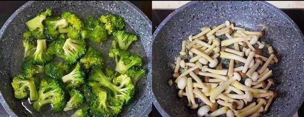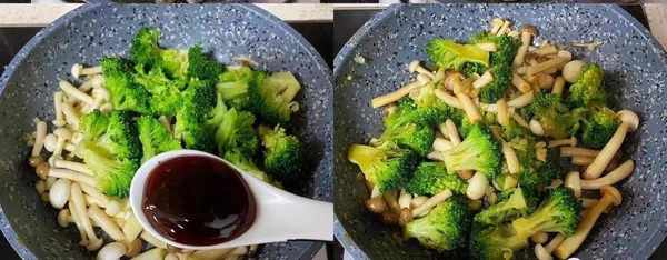 3、继续在西蓝花和海鲜菇中,加一勺蚝油,少许胡椒盐调味,炒半分钟就可以起锅。