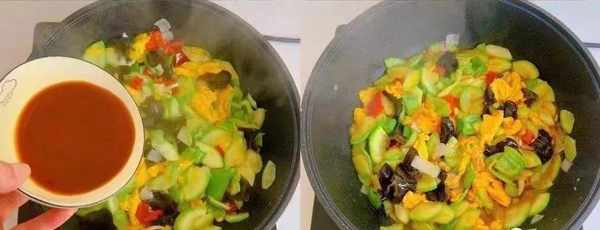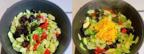 2、接着热锅放油,倒入蛋液炒熟,暂时捞起来备用。重新热锅放油,倒入西葫芦炒软。