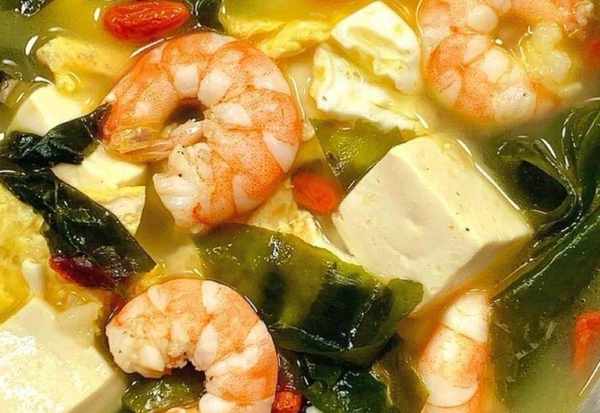 准备食材:虾仁,裙带菜,嫩豆腐,鸡蛋,枸杞子,姜丝,蒜末。