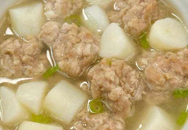 3、山药大概煮五分钟,煮熟后转小火,将肉末团成丸子放进来,全部煮至浮起来,再转中火煮三分钟。