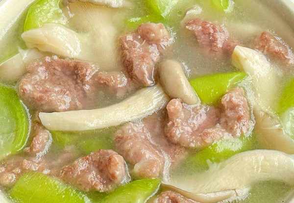 准备食材:丝瓜,菌菇,牛肉,姜片。