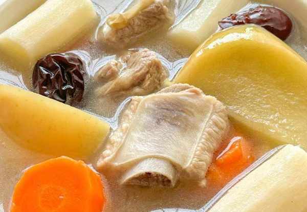 3、将排骨、山药、胡萝卜、红枣和姜片放入汤锅中,加入足量的清水,盖上盖子炖煮一个小时。