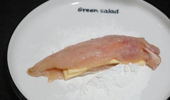 4.这是包好芝士片的鸡胸肉。如果是马苏里拉芝士不容易操作,我们就需要用到牙签将它封口。