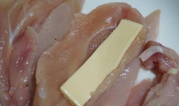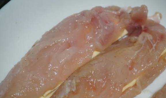 3.对半划开的鸡胸肉,加入2长条芝士片或者马苏里拉芝士也是可以的,那样会拉丝。然后对着合上即可。