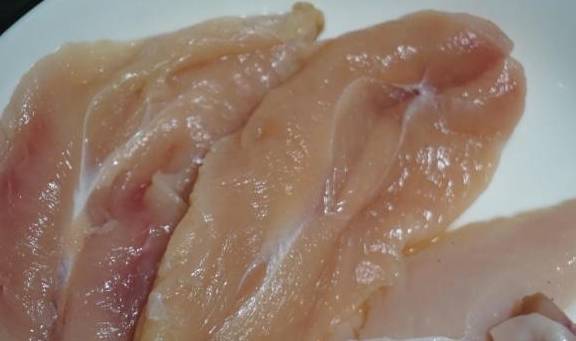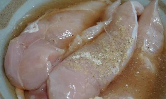 1.买来的鸡小胸肉,我们泡一会,洗干净,用料酒,姜汁,胡椒粉,盐和鸡精,将它腌制起来,这样可以去腥,入味一些。