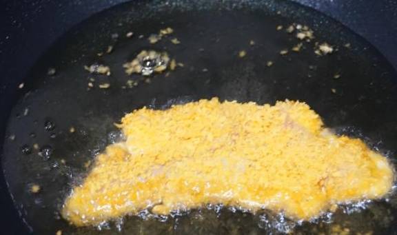 9.我们油锅要6成热的时候放入鸡排,一面炸金黄了,再翻面,这样可以很好的定型,不会散开。我们要注意这时的火候了,它不易过热,过热的油温外皮熟了,里面没有熟,也不能太凉,不易定型。待鸡排一面金黄,翻面后再次炸好,里面就熟透了,此时,我们不要着急出锅,将油温升至8成热,这样炸一下可以使外皮酥脆,也不会吸很多的油。