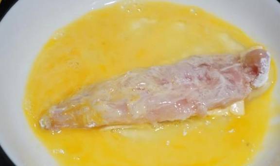 7.然后蘸一圈鸡蛋液,包裹住淀粉,也更容易蘸上面包糠。