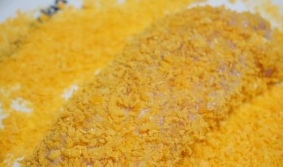 8.将它放入面包糠的盘中,按压实,抖一下,这样炸的时候不会落的锅里都是渣子。