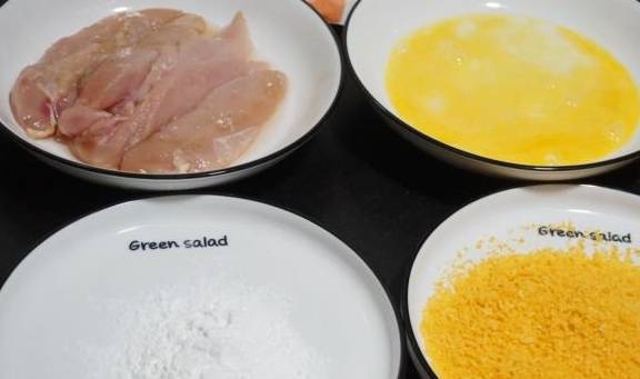 5.这时,我们准备3个容器,分别放玉米淀粉,鸡蛋液,和面包糠。面包糠,我选择的是黄色的,更好看一些,白色的也是没有问题的。