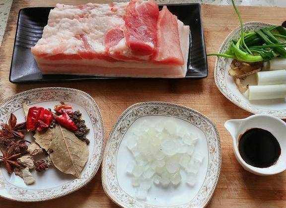 主要材料有:五花肉,香叶,八角,茴香,桂皮,生姜,红辣椒,大蒜,大葱,冰糖,老抽,料酒,盐。