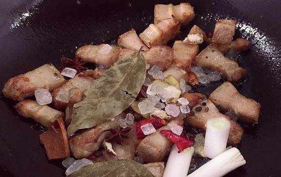 2、五花肉锅里炒一下,炒至发黄,油煎得差不多的时候,倒入一点生抽上色,放入香叶,八角,茴香,桂皮,红辣椒,大葱,翻炒一下,然后加入适量冰糖,炒化。