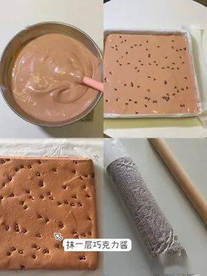 蛋糕卷出炉后,稍微放一下,抹上巧克力酱,卷后定型即可。