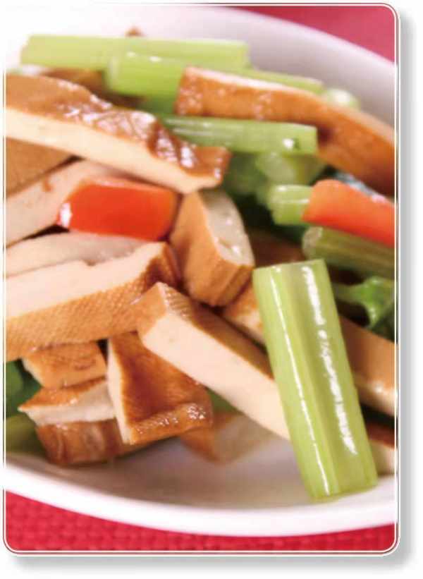 原料 豆腐干150克,芹菜100克,红椒2个,植物油10毫升,盐0.5克,蒜末适量,酱油2毫升。