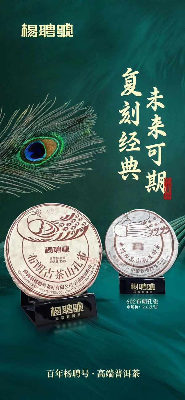 在近期孔雀概念不断复刻新品的时候,除了今大福复刻无星班章孔雀,杨聘号也复刻了大益602批布朗古茶山孔雀青饼上市。