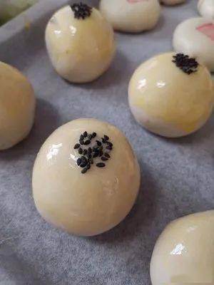 180度,中层,进去前先刷一遍蛋黄,撒上黑芝麻,15分钟,然后再刷一遍蛋黄,进去再烤15分钟。