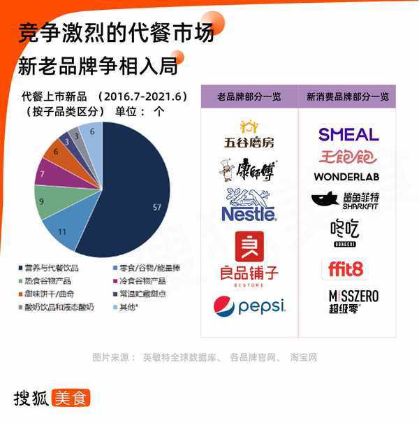 这其中不乏试水代餐市场的老牌食品公司和新兴创业公司。康师傅、雀巢、百事、良品铺子等知名食品企业先后进入了代餐市场,与此同时还诞生了一批新兴品牌,比如超级零、WonderLab、咚吃、smeal等。营养与代餐饮品成为各大品牌的主要产品线,在2016-2021年期间,该子品类的上市新品高达57个,远超其他代餐类产品。
