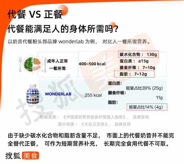 关于代餐的争议一直不少,其中不乏“代餐无用论”“代替不了正餐”“5天瘦5斤”等言论,相信代餐减肥的人投入大量金钱,不相信的人对其嗤之以鼻。以奶昔代餐粉头部品牌Wonderlab为例,搜狐美食将其与人体一餐所需的营养元素做了对比,我们发现,其中缺少人体所必须的碳水化合物,脂肪含量未达标准,两者不能画上等号。