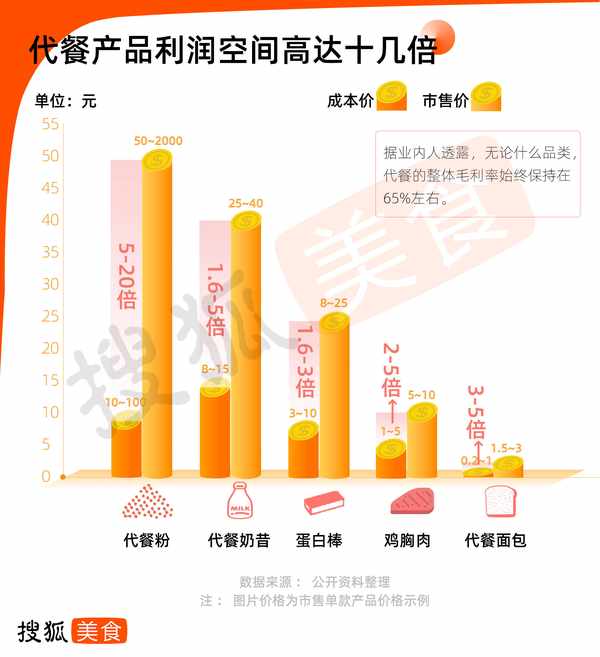 根据长城证券数据,某代餐品牌通过代工厂直销价格仅为10元左右,每瓶奶昔存在 10 元以上利润空间。曾有新闻爆出400元的代餐粉实际上是普通果蔬粉,成本价仅需20元。无论何种品类,代餐食品的利润均在成本价的1.5倍以上,其中代餐粉的利润最高可达到20倍。