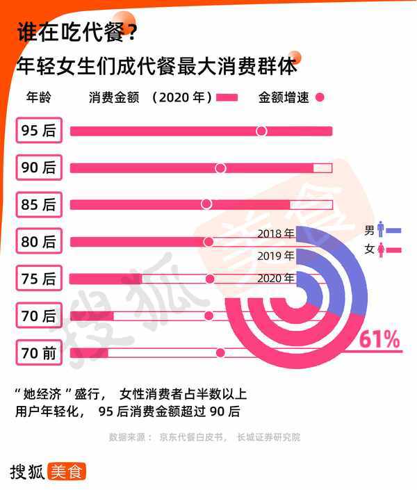 代餐食品是指能取代部分或全部正餐的食物。由于具有高纤维、低热量、易饱腹的特点。“好看好吃好瘦”的代餐食品成为食品新潮流,受到越来越多减肥者的青睐。伴随着“她经济”崛起,从2018-2020年,女性消费者占比逐年上升,目前已超半数。95后赶超90后消费者,增速远超其他年龄群体,消费金额跃升最大。一线城市的年轻白领成为代餐的重要受众。