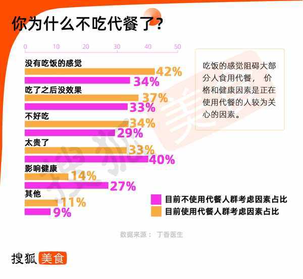 代餐品类正在被很多人质疑,伴随而来的是大量消费者的流失。对于正在食用代餐的人群来说,超40%的人认为吃代餐并没有吃饭的感觉,对于尚未食用代餐的人群,平均每餐20-30元的价格成为阻碍他们购买代餐的主要因素。
