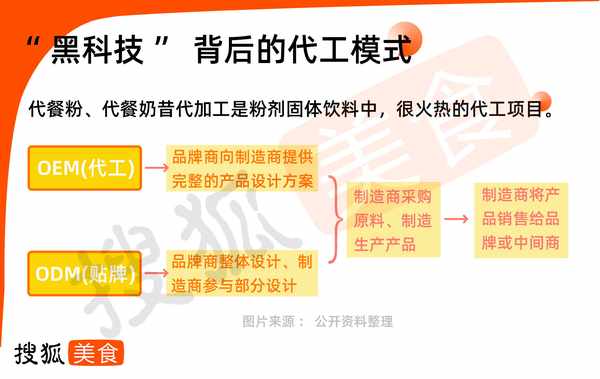 目前市面上的代餐品类繁多,同类产品的同质化现象十分严重,打着”黑科技“的旗号做营销的各大品牌,产品本质上并无大异。目前市面上代餐产品的生产主要采用代工模式,分OEM和ODM两种。品牌并非自有供应链,大多向生产代餐食品的工厂提供产品设计方面的方案,待由工厂生产结束后交付完成。