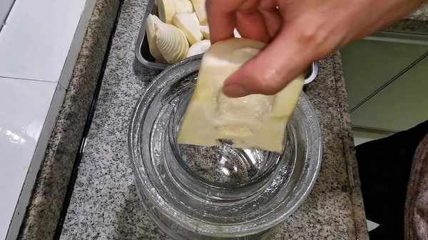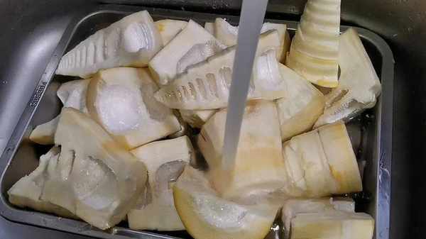 在对竹笋进行准备的这个过程中,全程不能让竹笋和有油的东西进行接触,竹笋一旦和油接触以后,在腌制的时候,就特别容易生花。接着我们要准备一个玻璃坛子,把玻璃坛子冲洗几遍,如果里面有油的话,放上一些洗洁精,反复清洗几遍,保证坛子中无油。