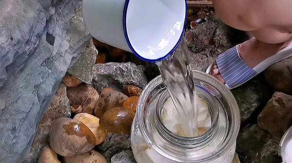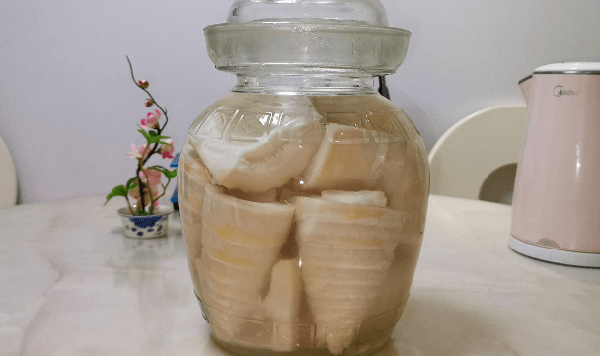 最后要往玻璃坛中加入足够多的山泉水,纯净水或者是凉开水,并盖上盖子,再往盖子外圈加入一圈清水,对竹笋进行密封腌制就可以了。像夏天这样炎热的天气里,腌制20天左右即可。酸笋在腌制的时候,如果发现坛子边缘的水没有了话,要及时补充,否则酸笋也很容易生花。