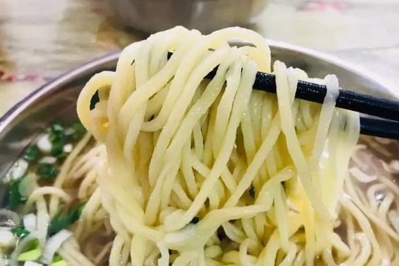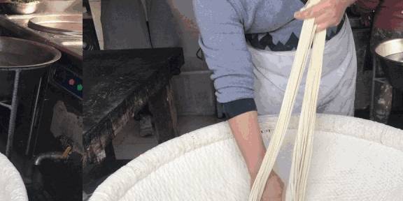 总的来说,摔面和拉面的唯一区别,拉面是不停的拉扯,摔面是不停地把面往板子上摔!用摔代替揉,这样做出来的面更有韧性,口感更好。